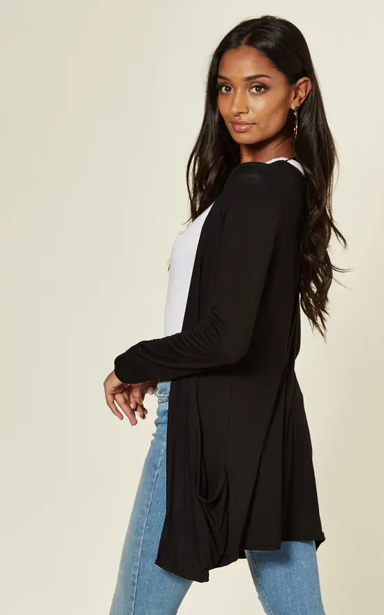 The Boyfriend Jersey Cardigan With Pockets In Black is a flowing cardigan in a soft jersey weave that features front pockets in the same fabric, long sleeves and an open front with no buttons.