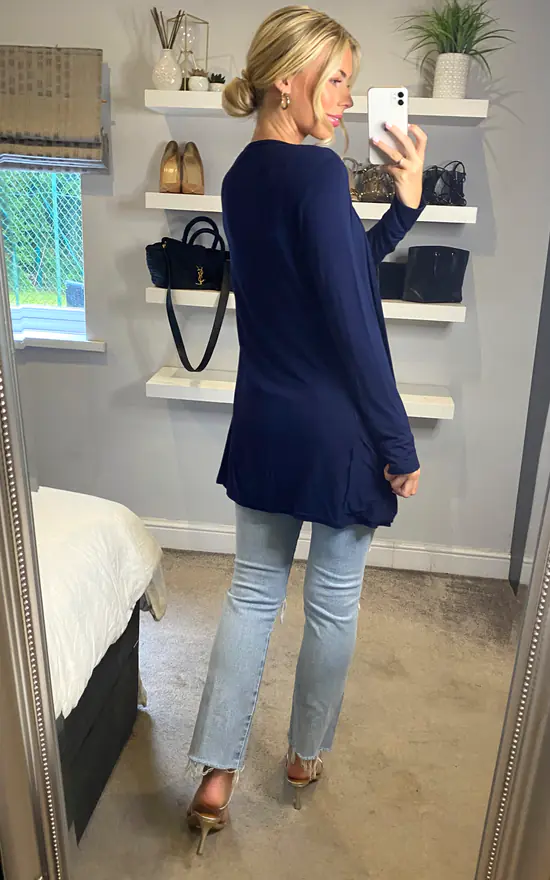 The Boyfriend Jersey Cardigan With Pockets In Navy is a flowing cardigan in a soft jersey weave that features front pockets in the same fabric, long sleeves and an open front with no buttons.