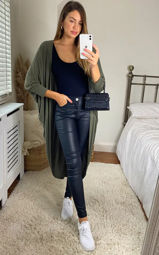 Aftershock London The Kimono Cardigan In Khaki is a longline cardigan that features a kimono design with long batwing sleeves and no buttons.