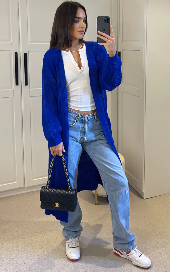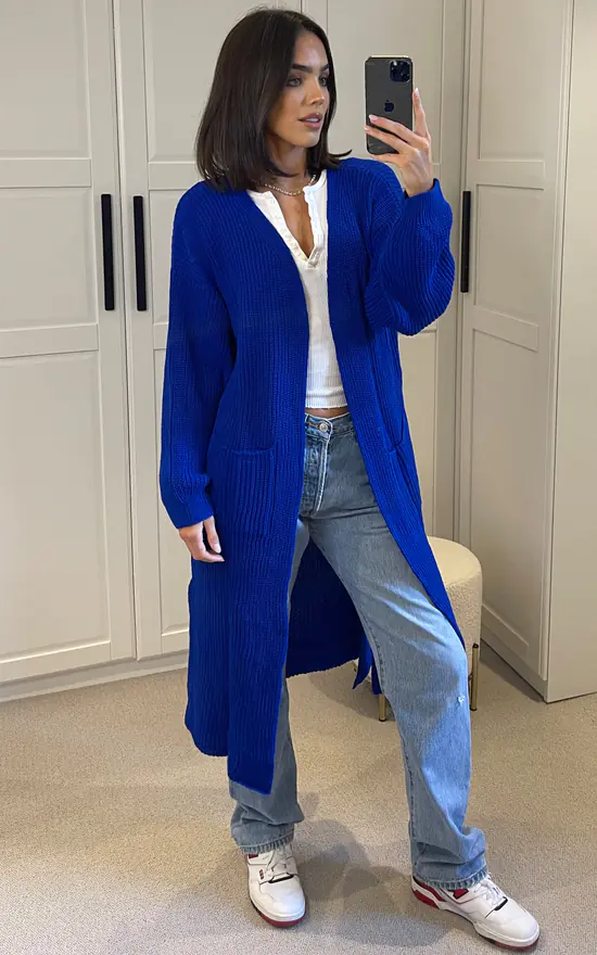 Aftershock London Knitted Longline Cardigan with Pockets in Royal Blue features a soft knit design with an open front with no buttons, dropped shoulders, long sleeves and front pockets.