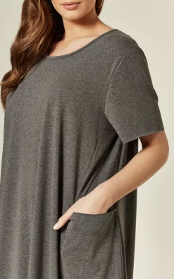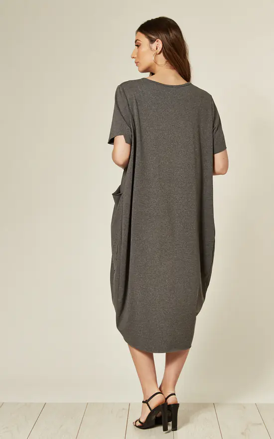 The Oversized Midi Dress With Pockets In Grey is a loose-fitting midi dress. This style features a round neckline, short sleeves and side patch pockets.