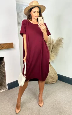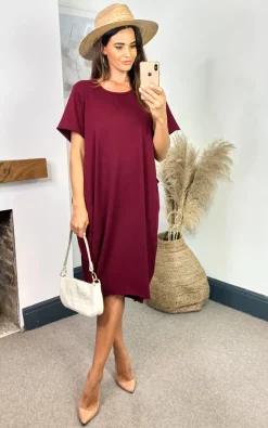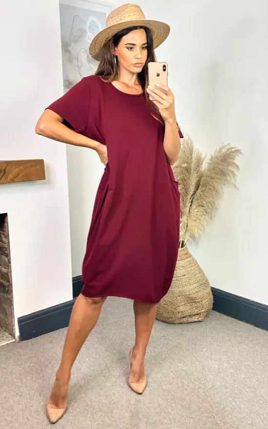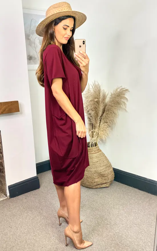 The Oversized Midi Dress With Pockets In Wine is a loose-fitting midi dress. This style features a round neckline, buttoned sleeves and side patch pockets.