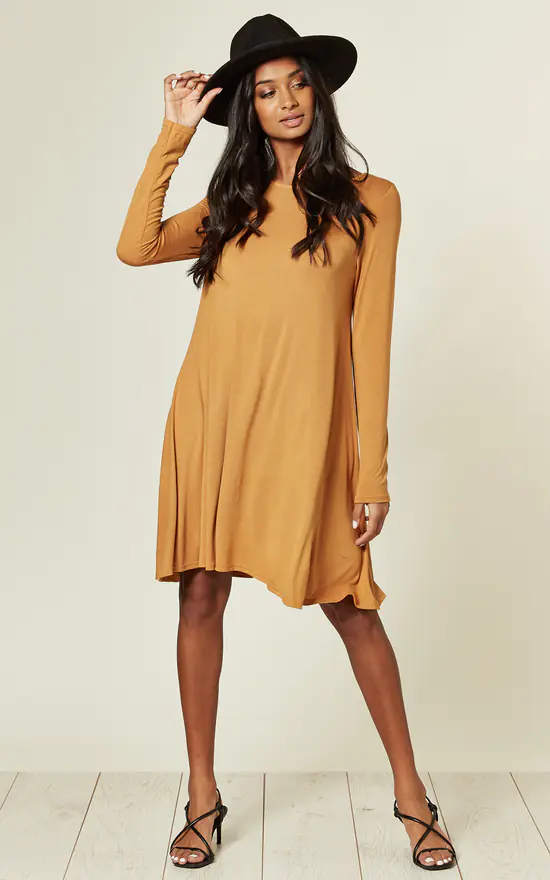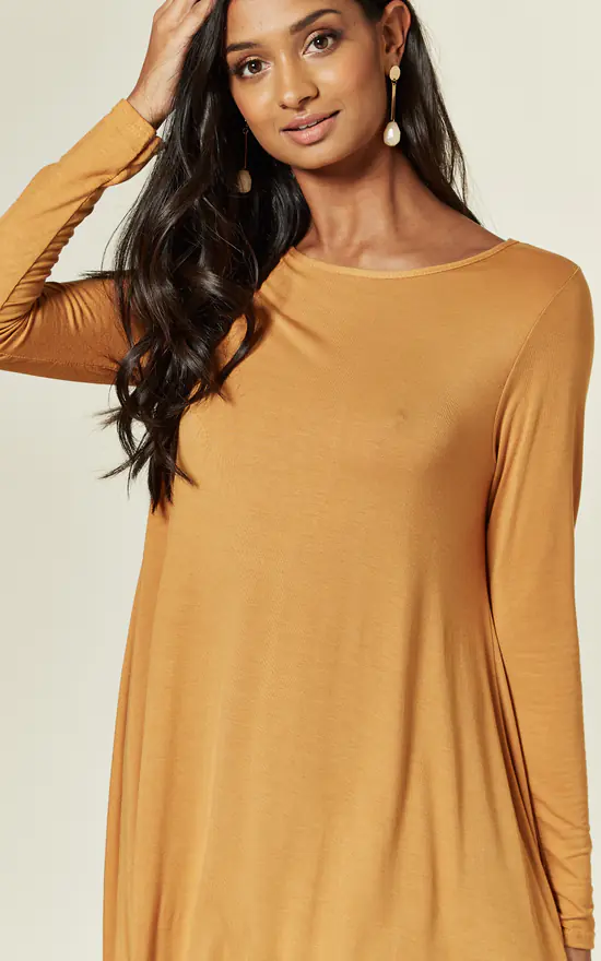 The Swing Dress in Mustard is a short A-line dress in a woven viscose blend. This basic jersey mini dress features a round neckline, long sleeves and loose fit design.