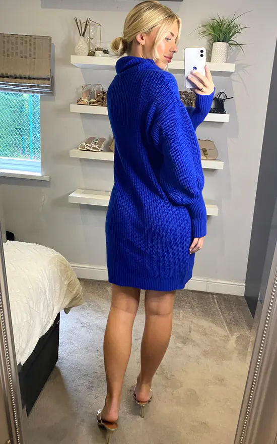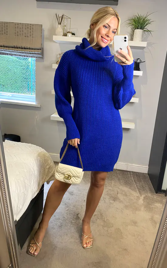 Knitted to a contemporary relaxed shape and featuring a warm cowl neck, this cobalt blue dress will be a wonderful addition to your winter wardrobe. Perfect for work, we will wear ours with knee high boots and chunky jewellery.