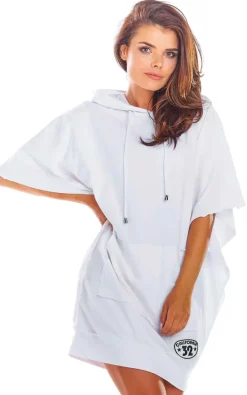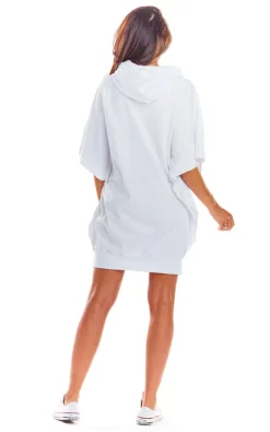 The dress has a hood and a large front pocket.
