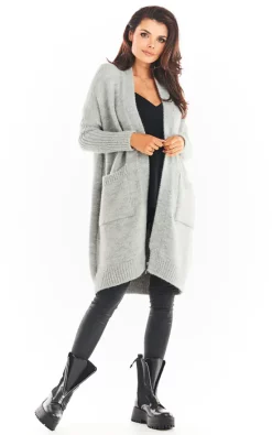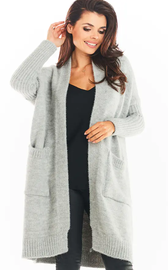 Unfastened cardigan with long sleeves, midi length. Two patch pockets at the front. The cardigan is woven in a nice knitted fabric with visible hair. The wide cut conceals the figure’s deficiencies.