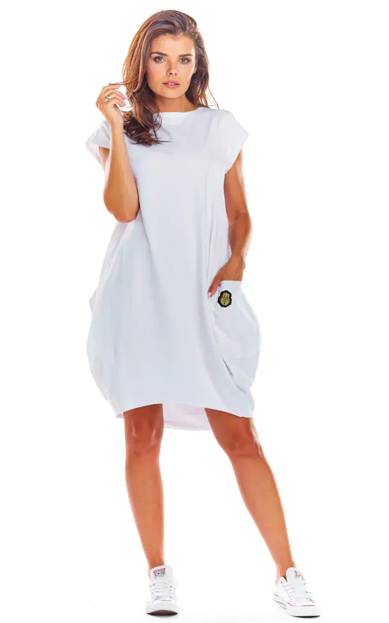 Loose dress with short sleeves and large pockets.