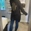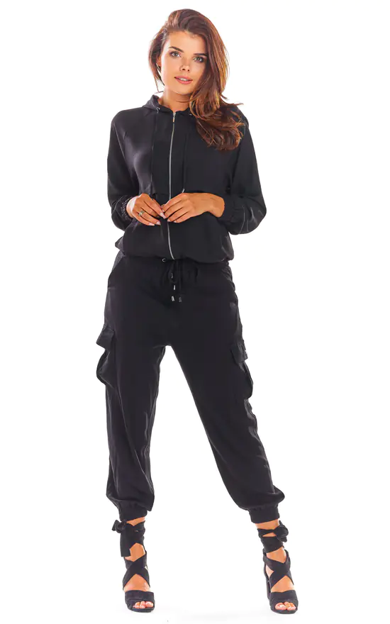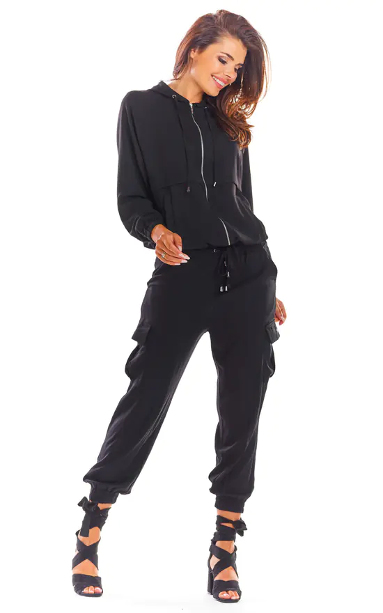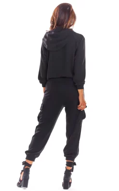 Sporty sweatshirt with a loose cut and hood. Zippered. The cut fits perfectly with A293 pants. Made of flowing material, it fits perfectly into the urban look.