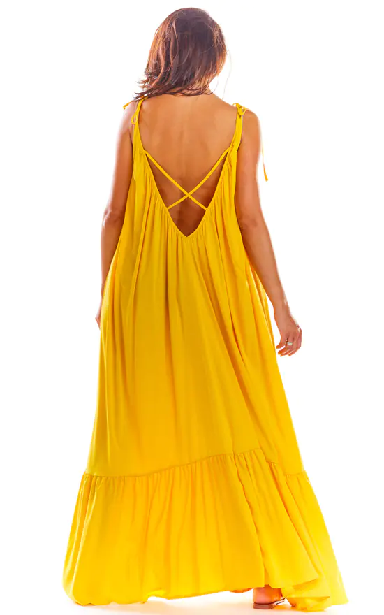 A loose oversized dress with a neckline at the back. It’s great when walking. Loose fit makes it fits any figure. The bottom of the dress is made of frill. The dress is perfect for the summer. Made of breathable and natural viscose.