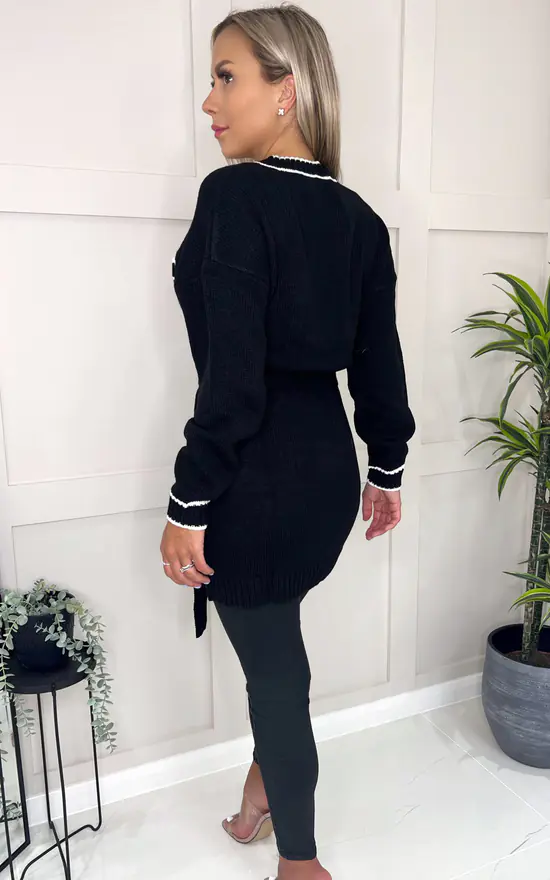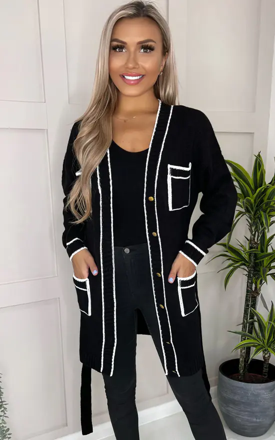 Our Black and White Contrast Detail Knitted Cardigan is a must have this season! Featuring white detail piping, 4 front pockets, a tie belt and gold button fastening. Simply pair with a bodysuit and jeans to complete the look.
