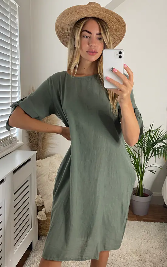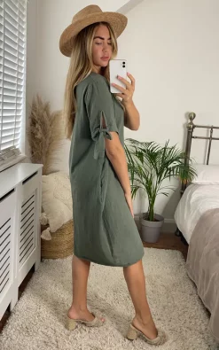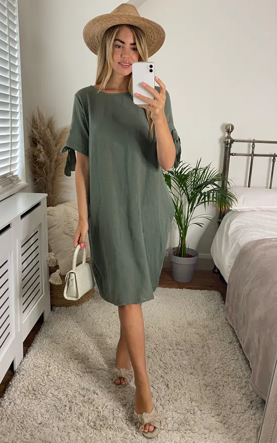 Bloat-friendly with ties at the sleeves – this khaki dress is comfortable, cute and perfect for daytime drinks.