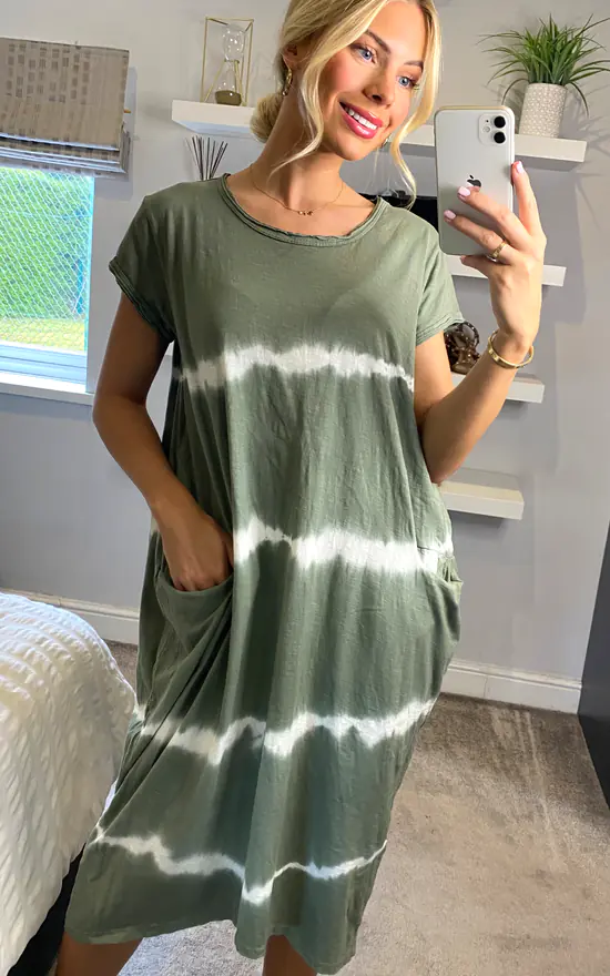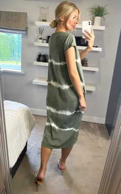 Feel comfortable and relaxed in this gorgeous casual khaki green tie dye relaxed fit midi dress, easy to roll for packing and would look great during the day to the beach, park or relaxed family gathering, but also in the evening with some wedge sandals