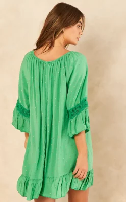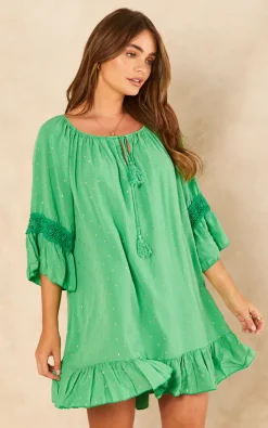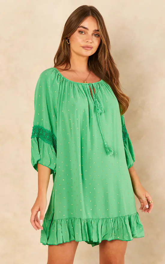 Going on a beach holiday this Summer? The Annalisa Crochet Sleeve Detail Dress In Jade is tassel front detail, frill sleeves and bottom, and a print that runs all throughout the dress. Perfectly matched with a straw bag and sandals, this dress is cute, playful and totally Blue Vanilla!