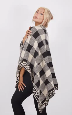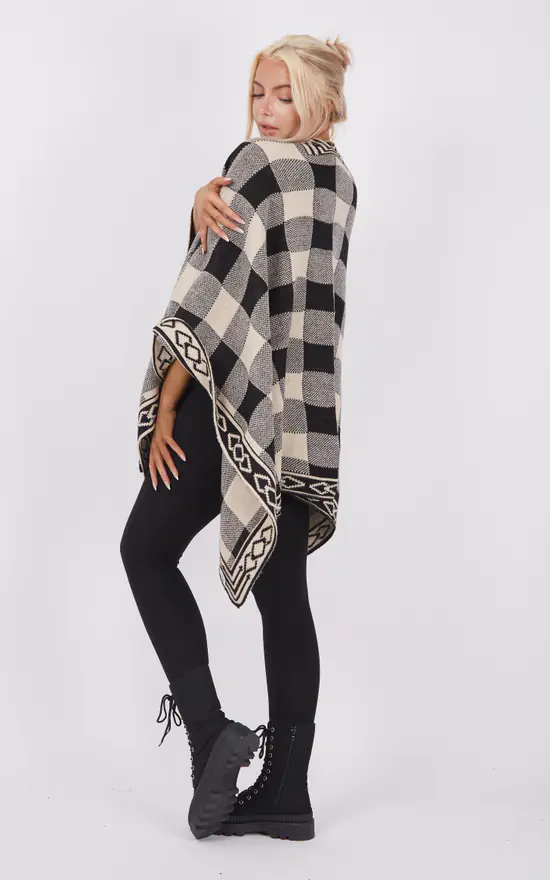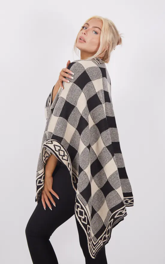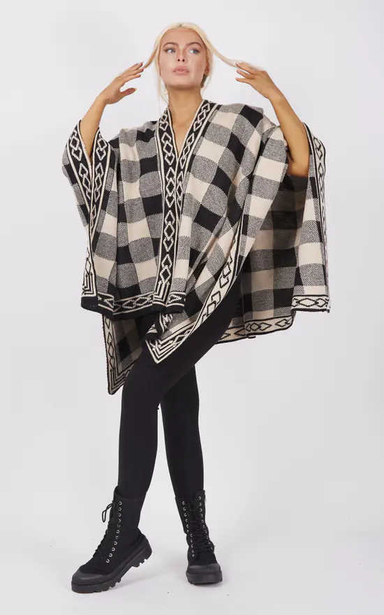 Our Beige and Black Check Print Poncho is part of our latest Poncho collection and will keep you warm and looking stylish during winter nights. Featuring an open poncho that fits sizes 10-20.