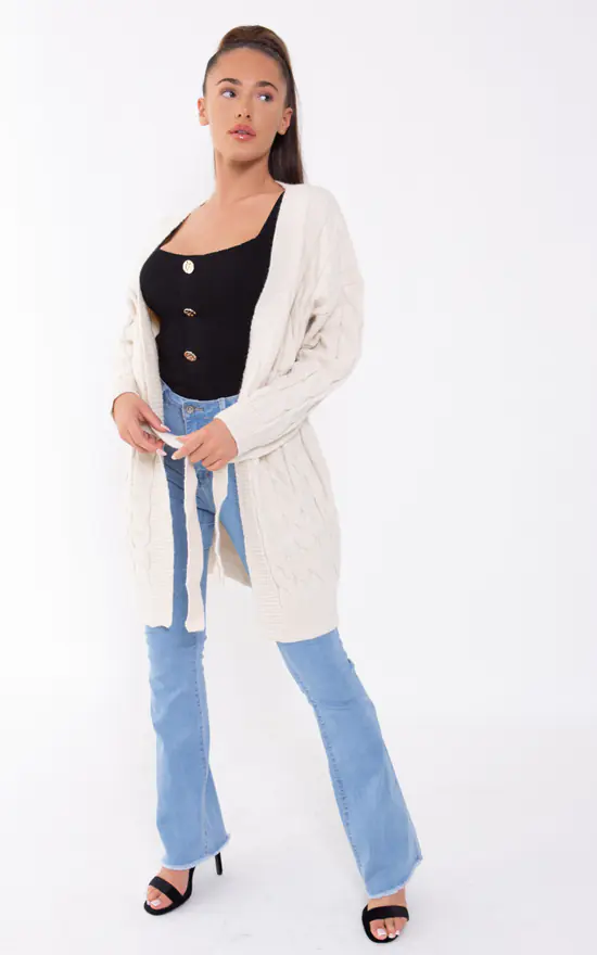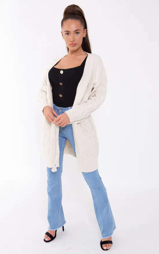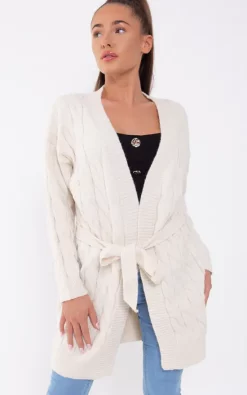 Our Beige Cable Knit Belted Cardigan is part of our latest Knitwear & Cardigans collection. A thick cable knit material with a tie waist belt, long sleeves and ribbed detailing.