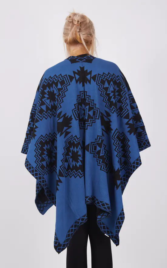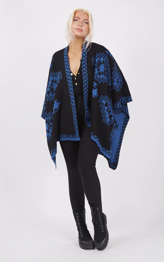 Our Blue and Black Aztec Print Poncho is part of our latest Poncho collection and will keep you warm and looking stylish during winter nights. Featuring an open, reversible poncho that fits sizes 10-20.