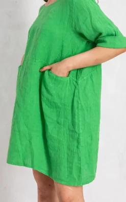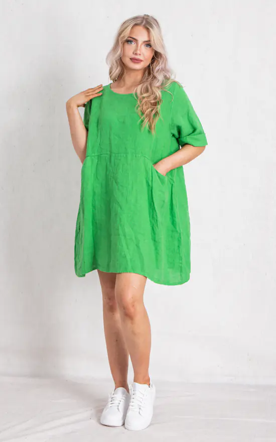 This Green Linen Round Neck Mini Dress is part of our latest dress collection! Featuring a lightweight linen material, round neck, short sleeve with turn up, pockets and finishing in a loose relaxed fit.