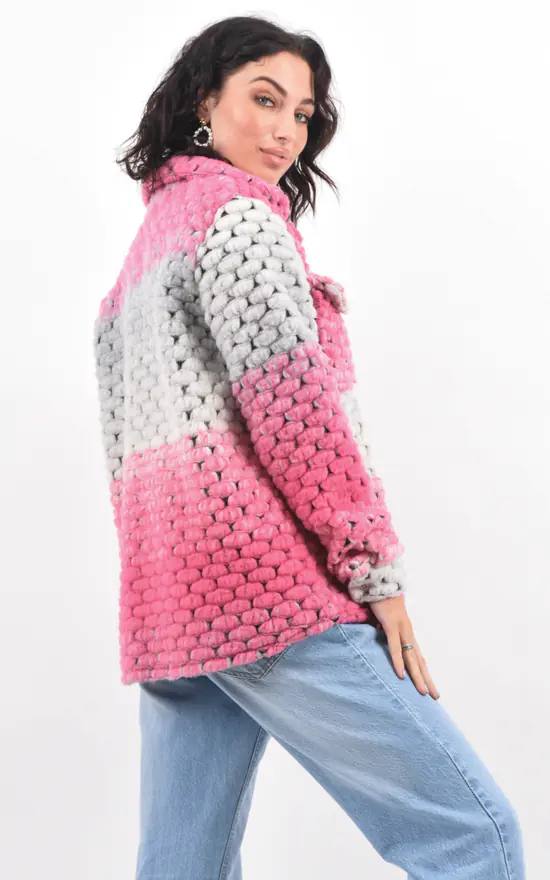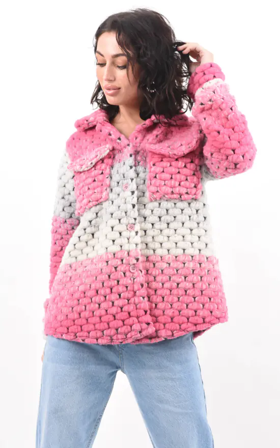 Our Pink Multicoloured Chunky Knit Shacket is part of our latest Coats & Jackets collection. A chunky knit wool material shacket in a multicoloured ombre design with a button up fastening, pocket detailing and a a spread collar.