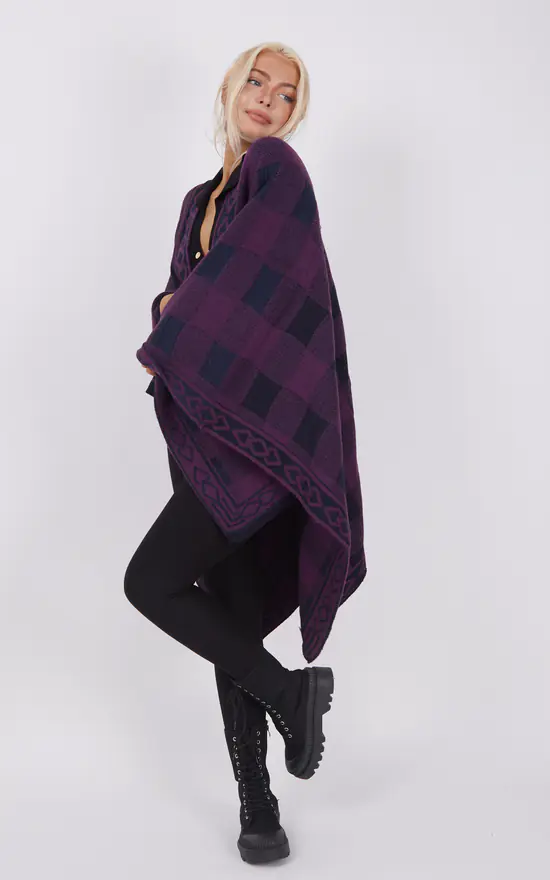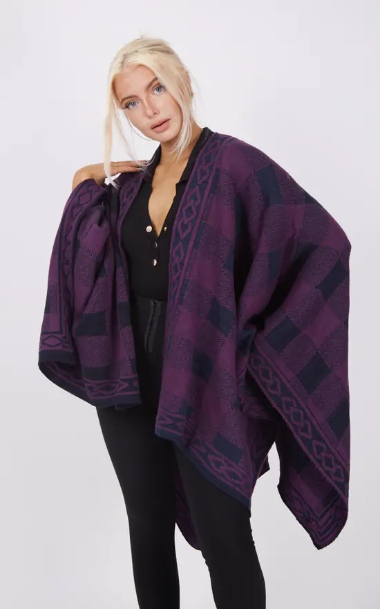Our Purple & Navy Knitwear Poncho is from our latest Poncho collection and will keep you warm and looking stylish during winter nights. Featuring a Knitwear, wide long length arms . Finished with eye-catching frayed trims.