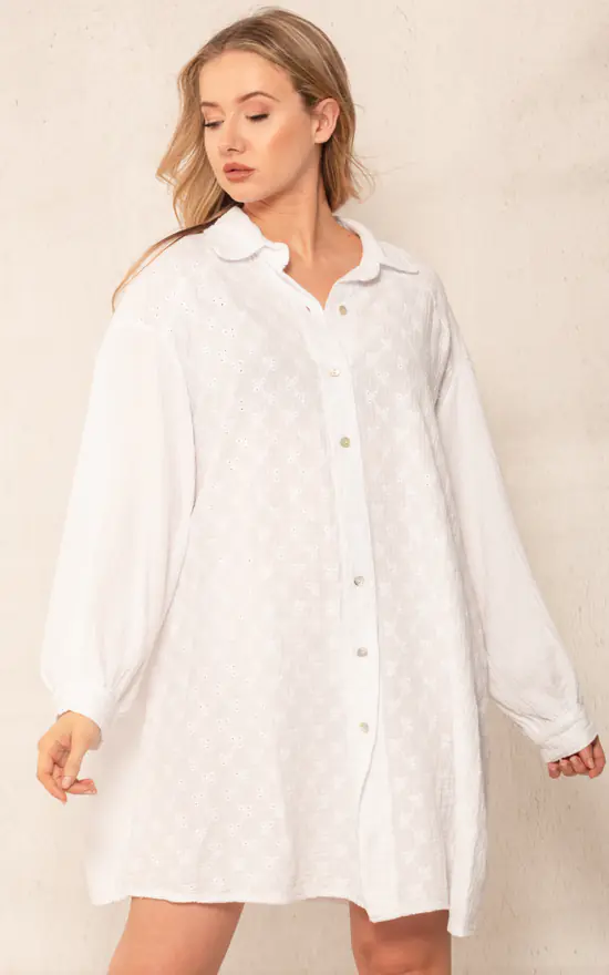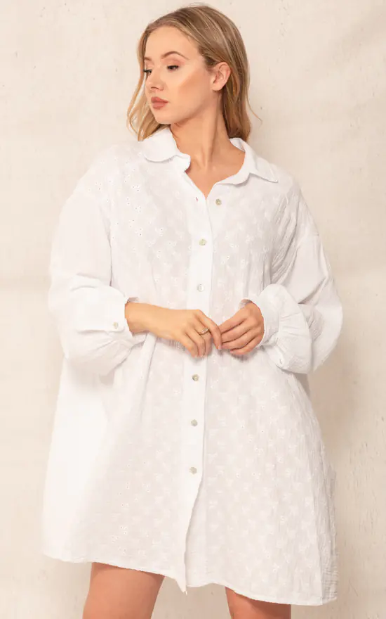 Our White Floral Broderie Shirt Dress is a ultimate Must Have.