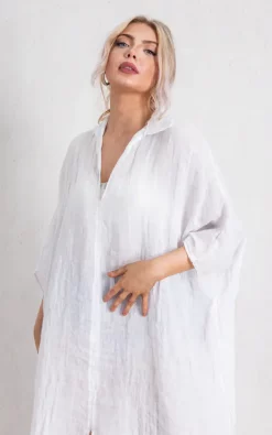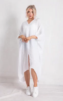 This White Linen V Neck Maxi Tunic is part of our latest dress collection! Featuring a lightweight linen material, v neck, short sleeve, collar, split in the middle and finishing in an oversized relaxed fit.