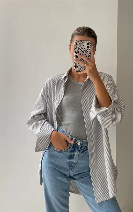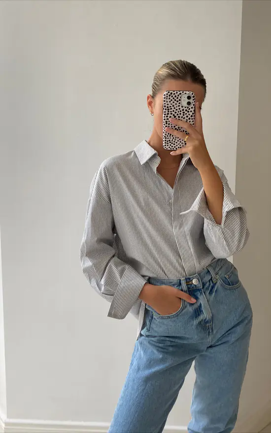 Effortless style made easy! This oversized striped shirt can be worn out or tucked in and takes casual chic to a whole new level.