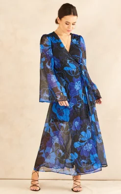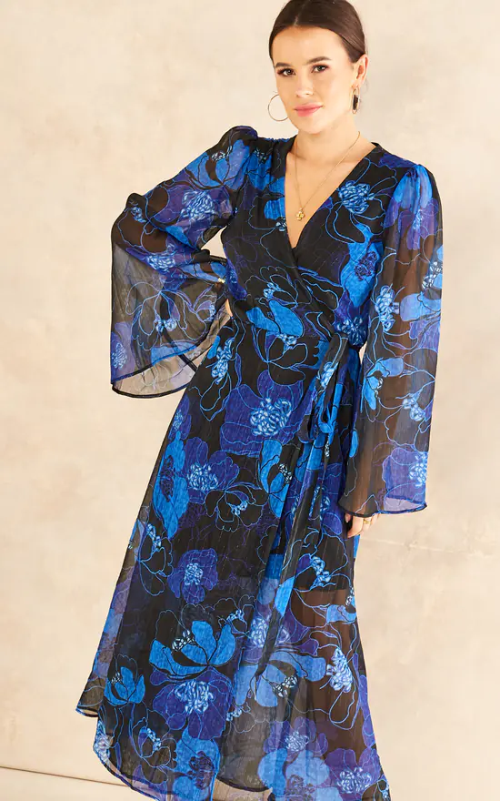 Make an entrance in the Luna wrap dress, with dramatic flared sleeves and a floor grazing hem. Crafted in a sheer fabric with a silver sparkle throughout, the oversized floral is printed in a striking cobalt blue seen all over the catwalk so you’ll be ahead of the trends this winter season!