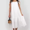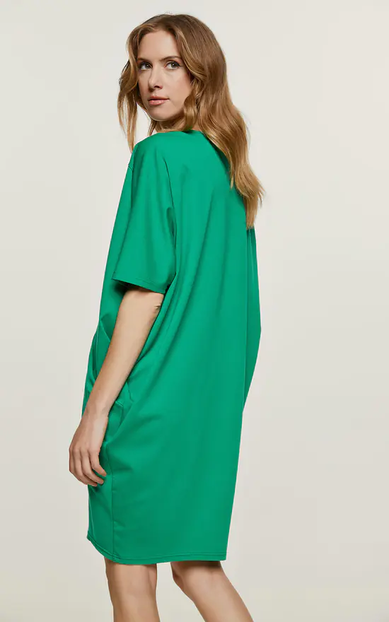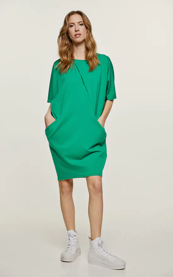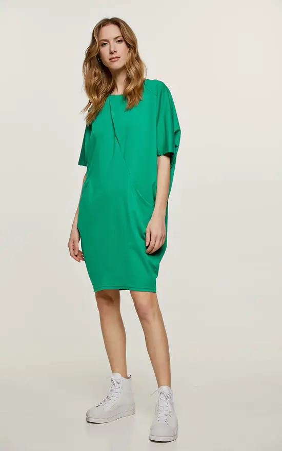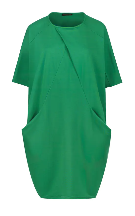 This green dress is crafted in Punto di Roma fabric. It is sleeveless and has a round neckline. There is a large pleat beginning just under the neckline and side pockets with faux leather detail on the inside. The dress is styled in a batwing silhouette starting at the shoulders.