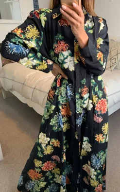 Long Sleeve Maxi Shirt Dress in Black Spring Floral Print Features: