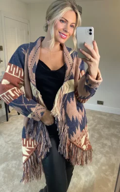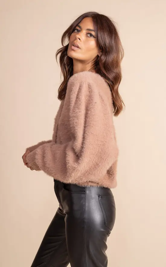 Time to get all comfy and cosy. Our Bambino Cardigan in Mocha is a great thrown on over a tee and jeans, or wear buttoned up on its own. Crafted from fluffy feather-knit fabric, this oversized cardi is hip length and perfect for colder months. Detailed with full length balloon sleeves and a 3 gold button fastening. Hand Wash Only.