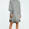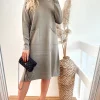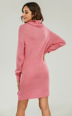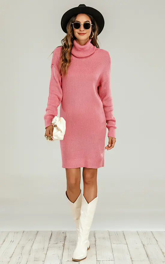 High neck jumper dress features long sleeves and is crafted from soft , stretchy knit ribbed material. Long sleeves with tailored cuffs.