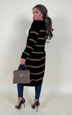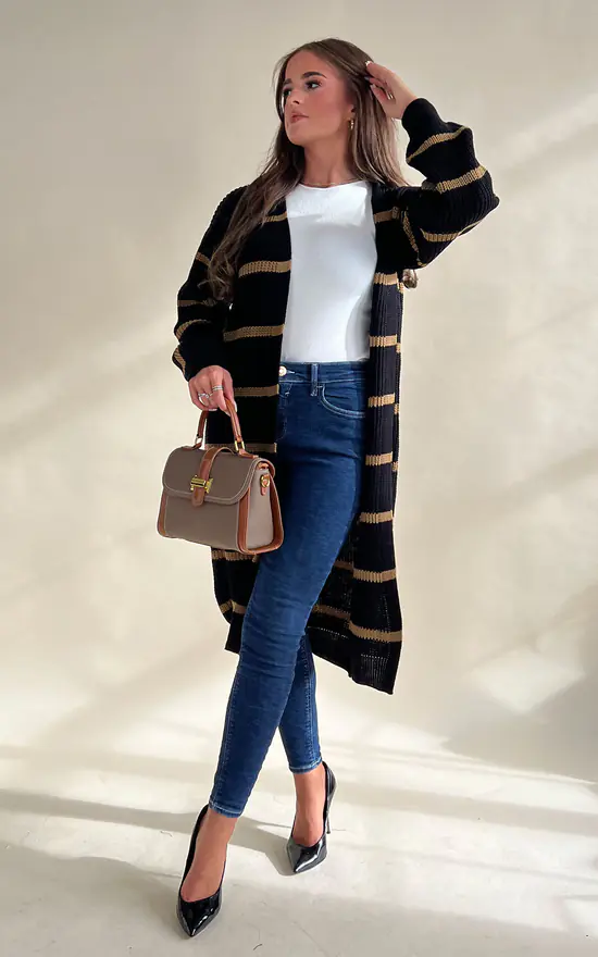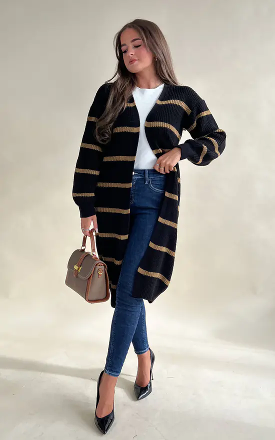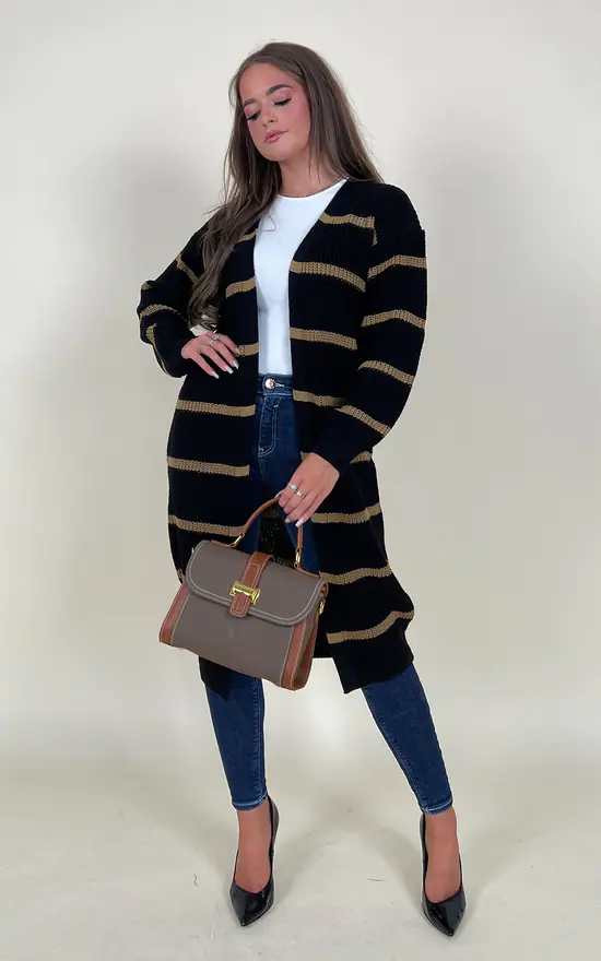 A wardrobe staple for all year round, this classic comfy Claire Black & Camel Striped Cardigan is easy to pull on and go! This soft knit cardi is perfect for taking you into autumn when you need an extra cover up with its long sleeve silhouette.