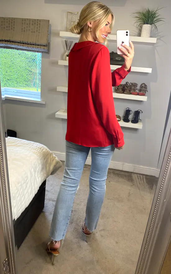 This Long Sleeves Detailed Collar Shirt in Red will be your favoUrite piece in your closet. Itβs very fashionable and If you match it with jeans, It can be so adorable!