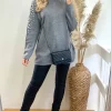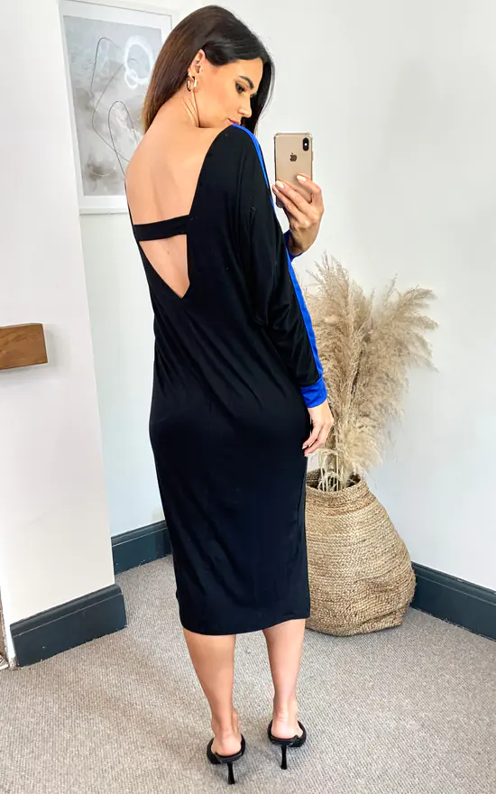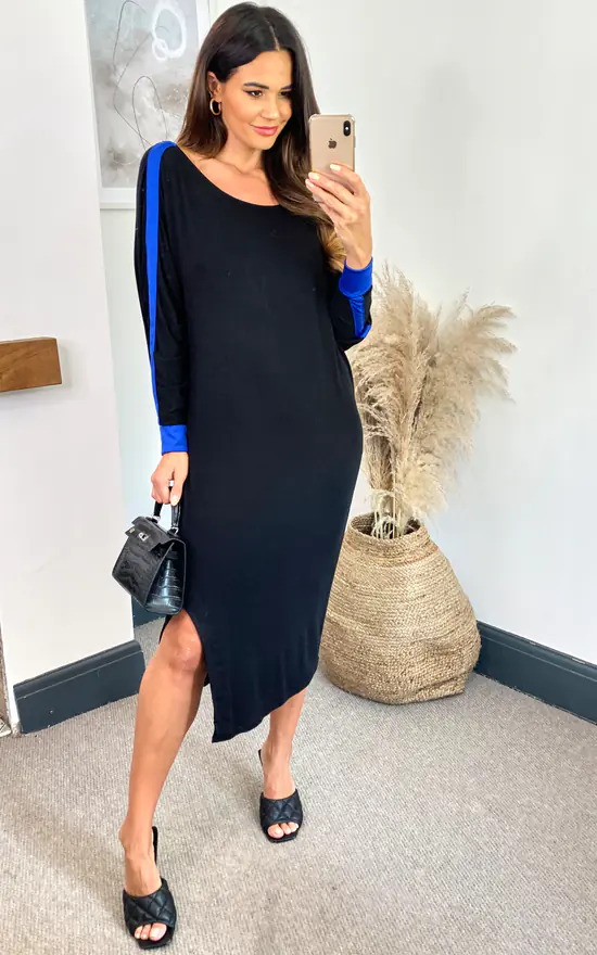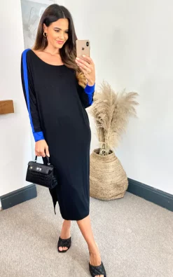 Long Sleeves Relaxed Midi Dress In Black With Lining Blue
