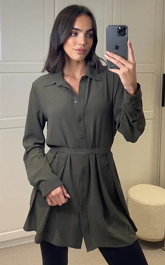 Oversized Long Slevees Pleated Shirt Top with Matching Belt in Khaki is the perfect choice to dress up your wardrobe! The belt detail adds a little something special to an otherwise basic shirt. The long sleeves keep you cozy and warm during the chilly winter months!