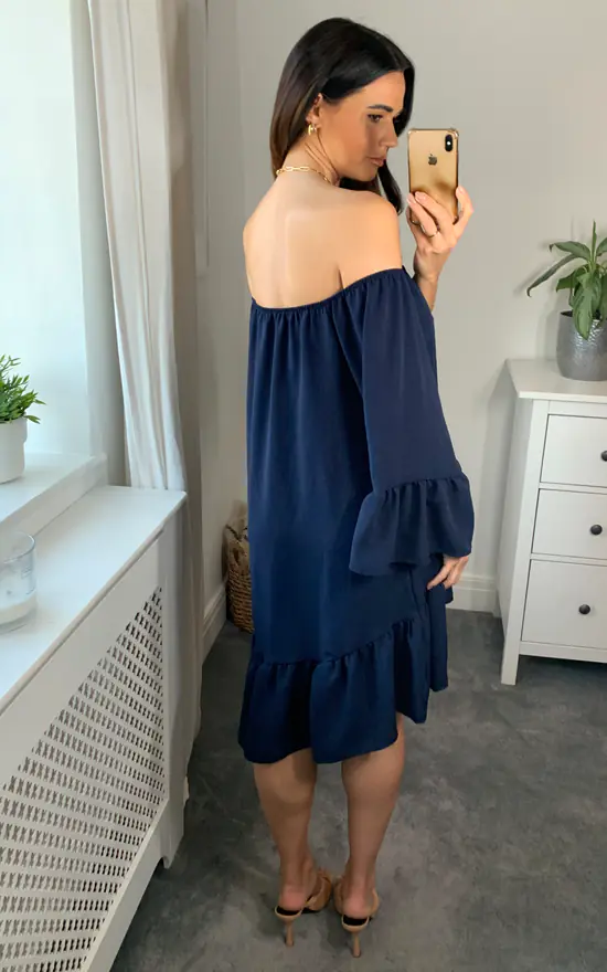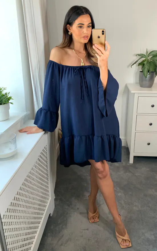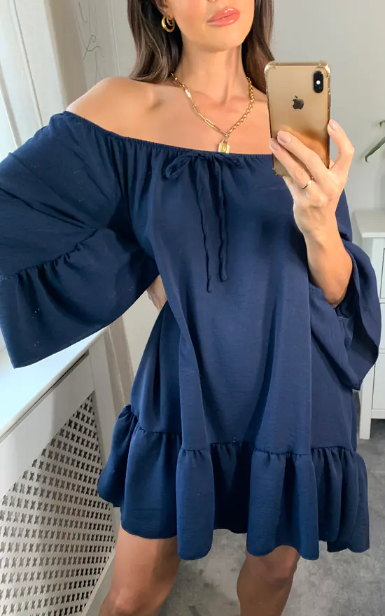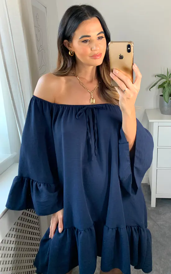 The Oversized Off Shoulder Dress with Tie Detail in Navy goes with everything. You’ll adore this chic and trendy dress for every event as much as we do!