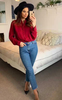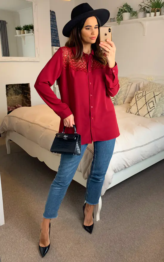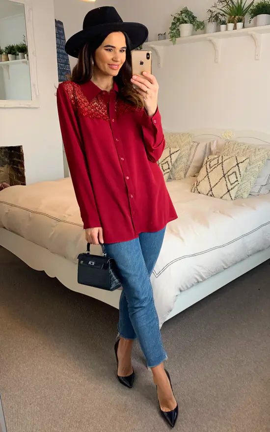 Cheap ๐ŸŽ HOXTON GAL Oversized ๐Ÿ‘• Shirt With Lace Detail In Burgundy โค๏ธ