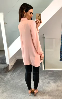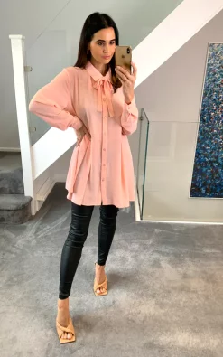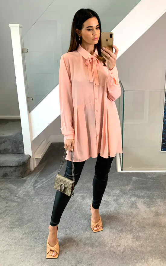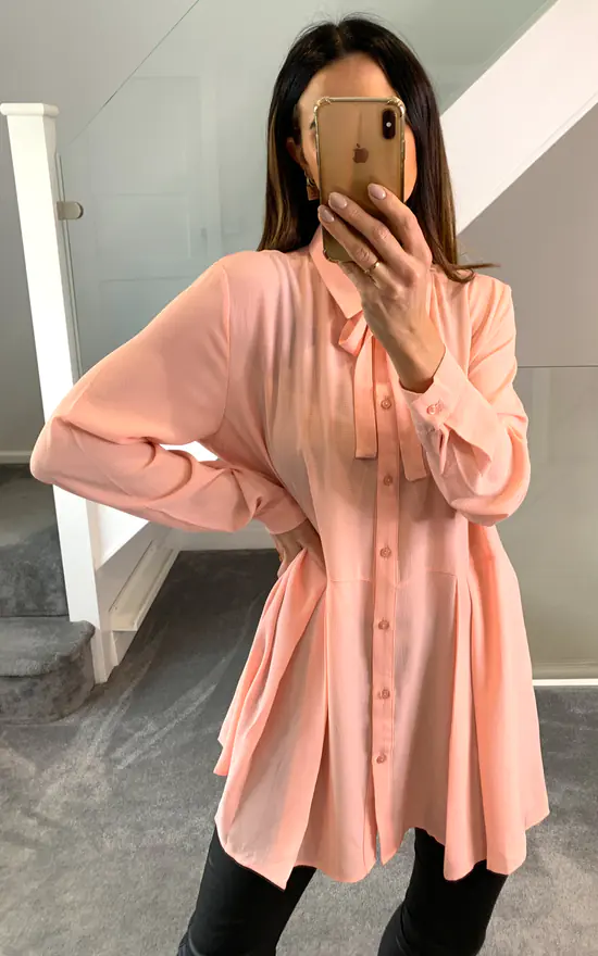 Oversized Tie Neck Pleated Shirt in Pink perfectly fits for workplace and also classy piece for autumn night outs, you can easily combine with basic jeans and tights. You can complete your look with basic necklace!