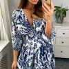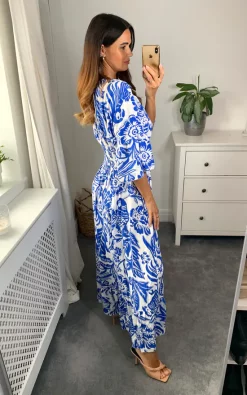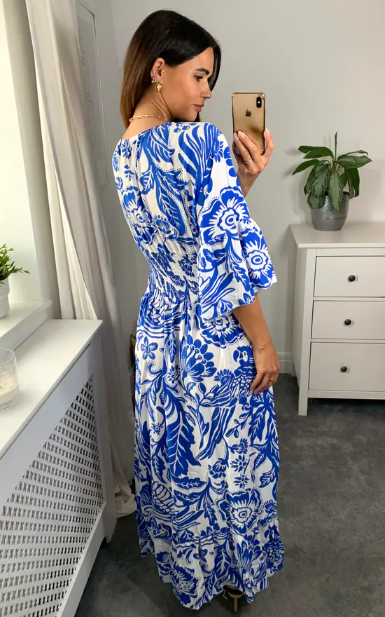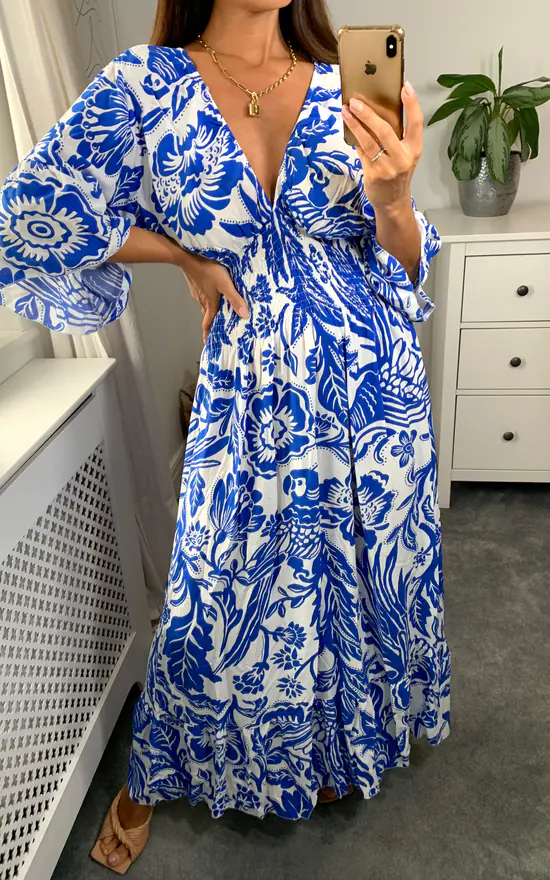 The perfect party dress for this season. Oversized V Neck Detailed Floral Print Maxi Dress in Blue and White will create the perfect impression to your look!