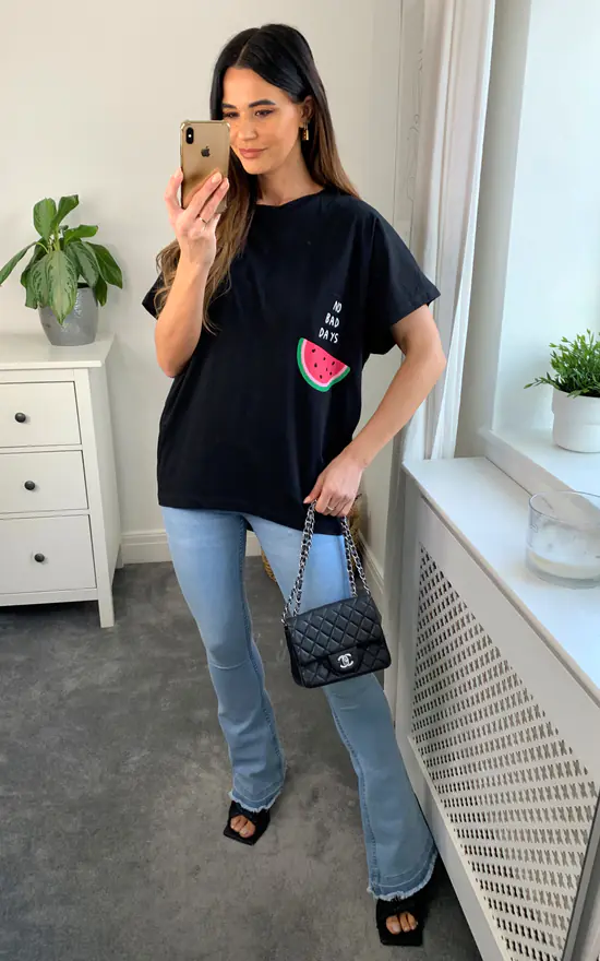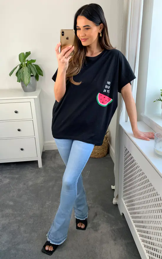 Fun and comfy way to dress well. Oversized Watermelon T-Shirt in Black is a very relaxed piece for hot autumn days. Features oversized style and print detail. This t-shirt is great for casual vibes.