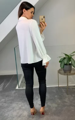 Ruffle Detailed Front with Ruffle Sleeves Shirt in White is perfectly fits for workplace and also classy piece for night outs, you can easily combine with basic jeans and tights!