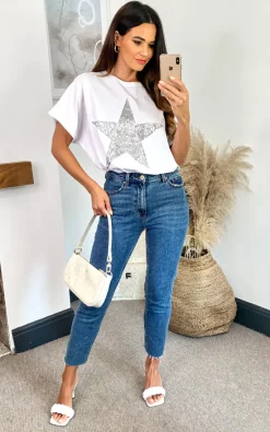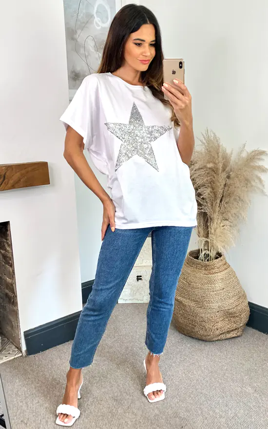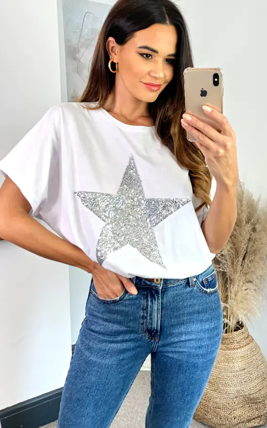 Buy ❀️ HOXTON GAL Sequin Star T πŸ‘š Shirt Relaxed Fit In White πŸ‘