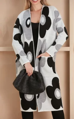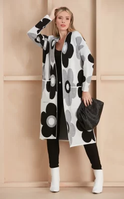 Longline Midi Cardigan with 2 pockets in Black/White Floral print. Stylish Cardigan/Coat for you autumn-winter outfits.