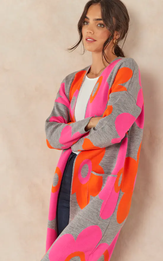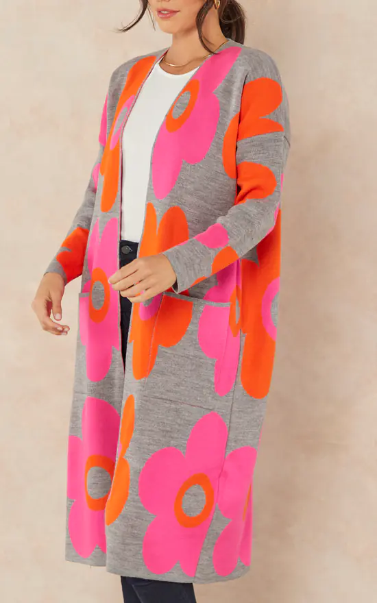 Longline Midi Cardigan with 2 pockets in Fuchsia Pink / Orange Floral print. Stylish Cardigan/Coat for you autumn-winter outfits.