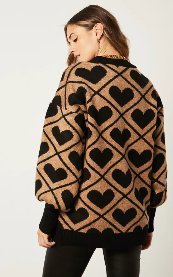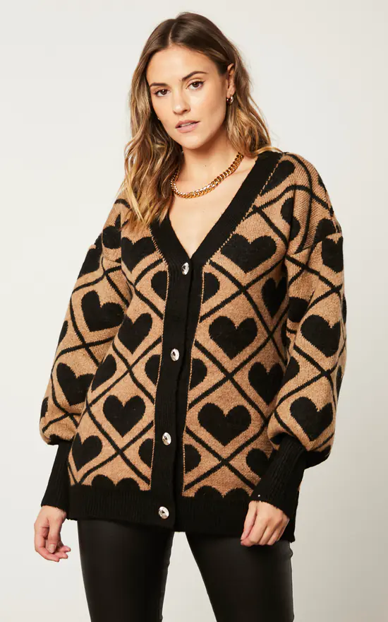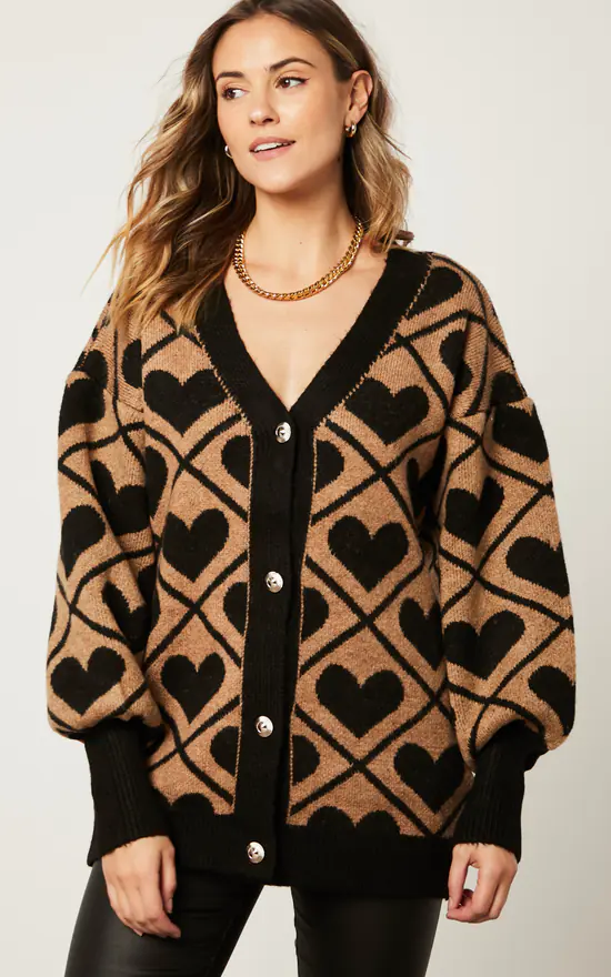 Oversize Stylish Cardigan in Black/Brown (Camel) Heart print with big buttons. Stylish Cardigan for your autumn-winter wardrobe.