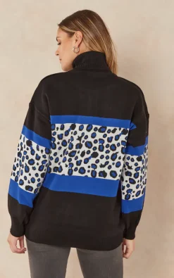 Oversize Roll Neck Knitted Jumper in Sax Blue Leopard print. Cozy and warm sweater for Autumn/Winter days.