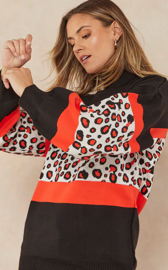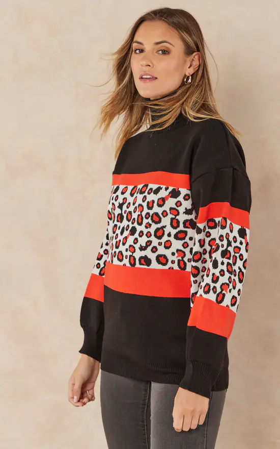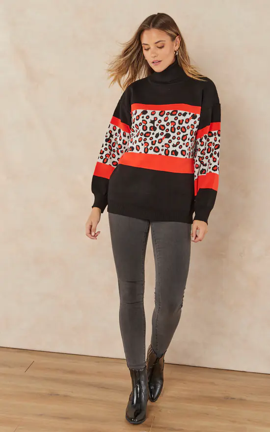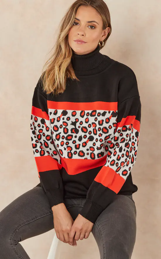 Oversize Roll Neck Knitted Jumper in Orange Leopard print. Cozy and warm sweater for Autumn/Winter days.