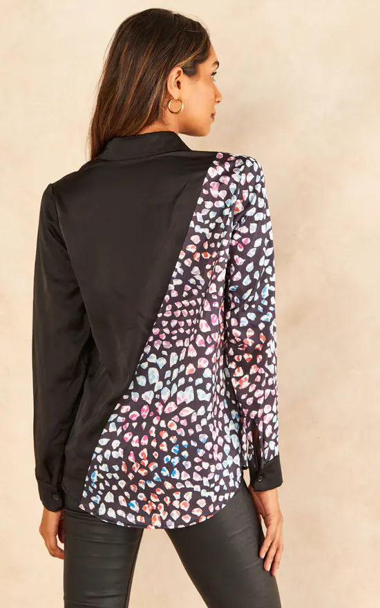 Long Sleeve Shirt in Stylish Colour Block Black/Blue Abstract Print. Buttoned at the front.