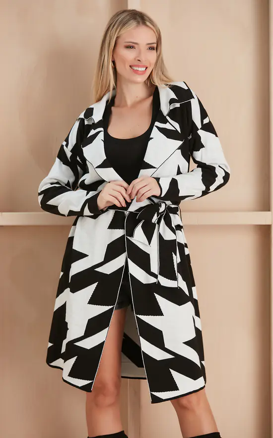 Longline Cardigan/Coat in Black/White Goose Foot print with best.
