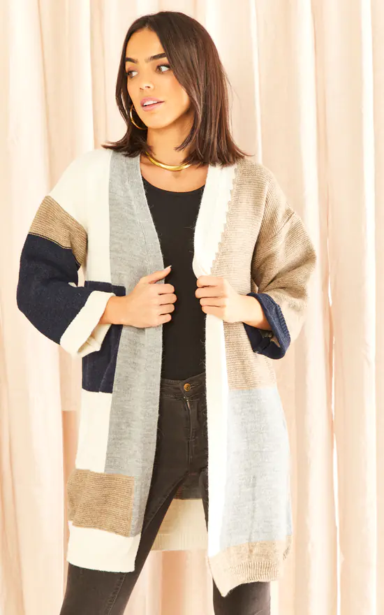 Long Sleeve Knitted Cardigan in Navy/Grey colour block. Longline cardigan is super warm and stylish.